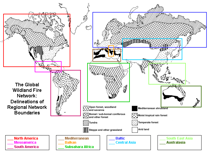 This world map (click for enlargement) shows the delineation of the Regional Wildland Fire Networks. The vegetation types correspond to characteristic fire regimes in the regions that are described in the background documents on the regional network web pages.